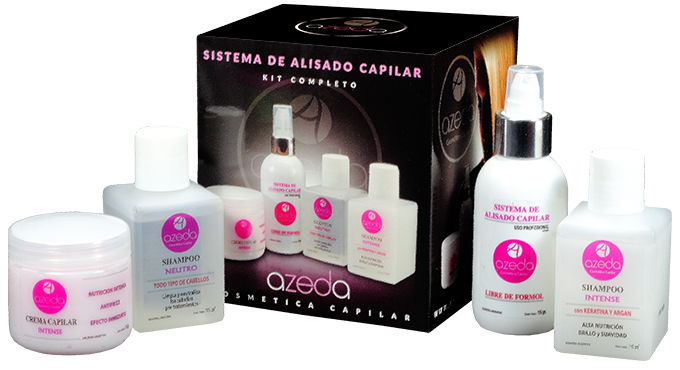 Contiene los cuatro productos necesarios para el alisado capilar: Sistema de Alisado Capilar Azeda Sin Formol de 120 grs., Shampoo Neutro de 115 c.c., Shampoo Intense de 115 c.c., y Crema Intense (nutrición intensa) de 110 grs. Hipoalergénicos. La fórmula de nuestro Sistema de Alisado Azeda esta enriquecida con proteínas y siliconas, logra modificar la estructura capilar y no se pierde con el lavado, ni con procesos químicos como coloración, reflejos, iluminación. Se obtiene un lacio con una durabilidad de 6 a 8 meses, dependiendo el tipo de cabello a tratar, logrando suavidad y movimiento naturales. Producto elaborado sin formol, aprobado por ANMAT (Administración Nacional de Medicamentos, Alimentos y Tecnología Médica) de la Secretaría de Salud del Ministerio de Salud y Acción Social de la República Argentina.